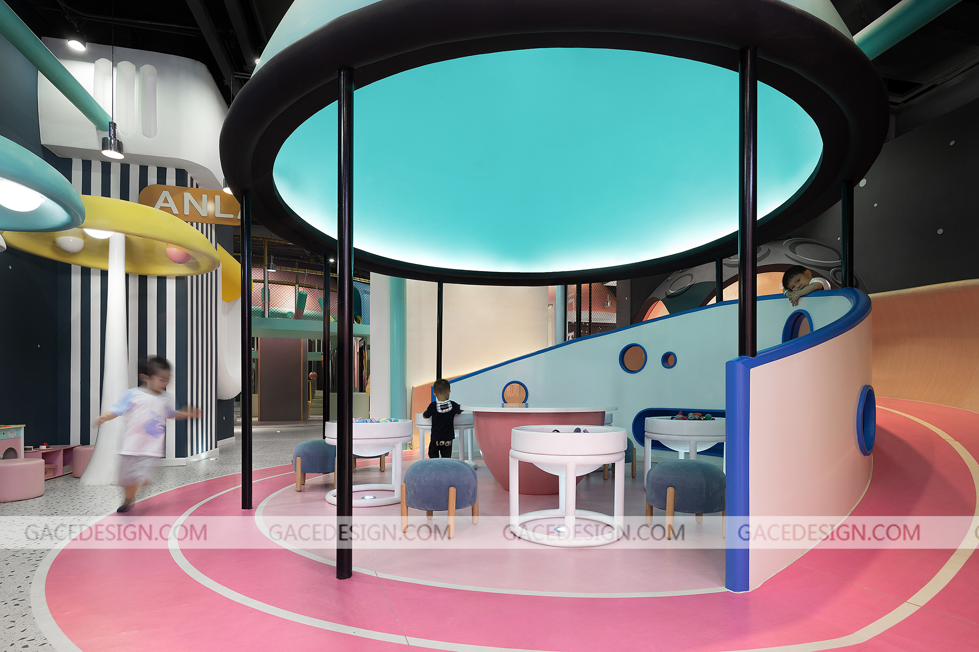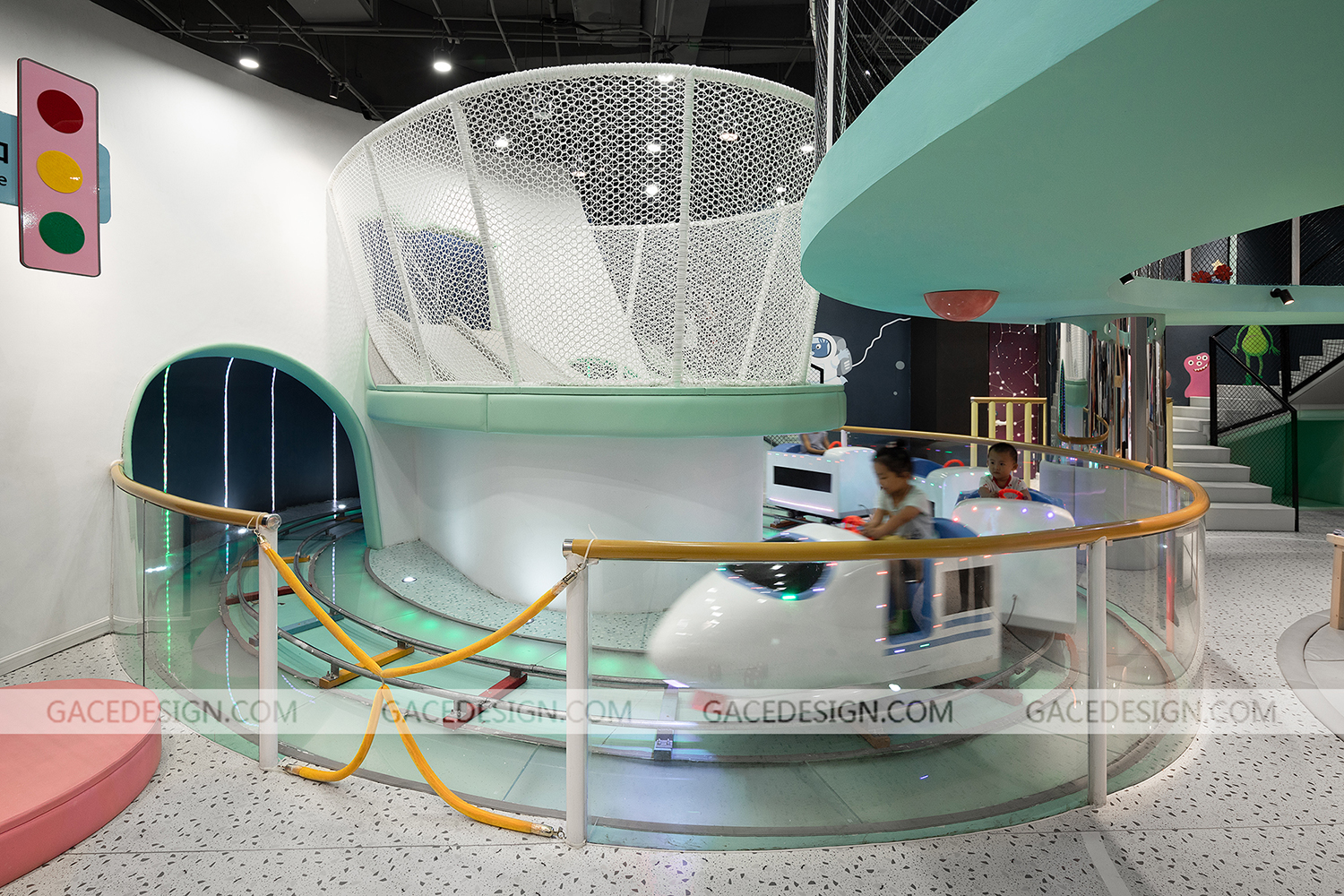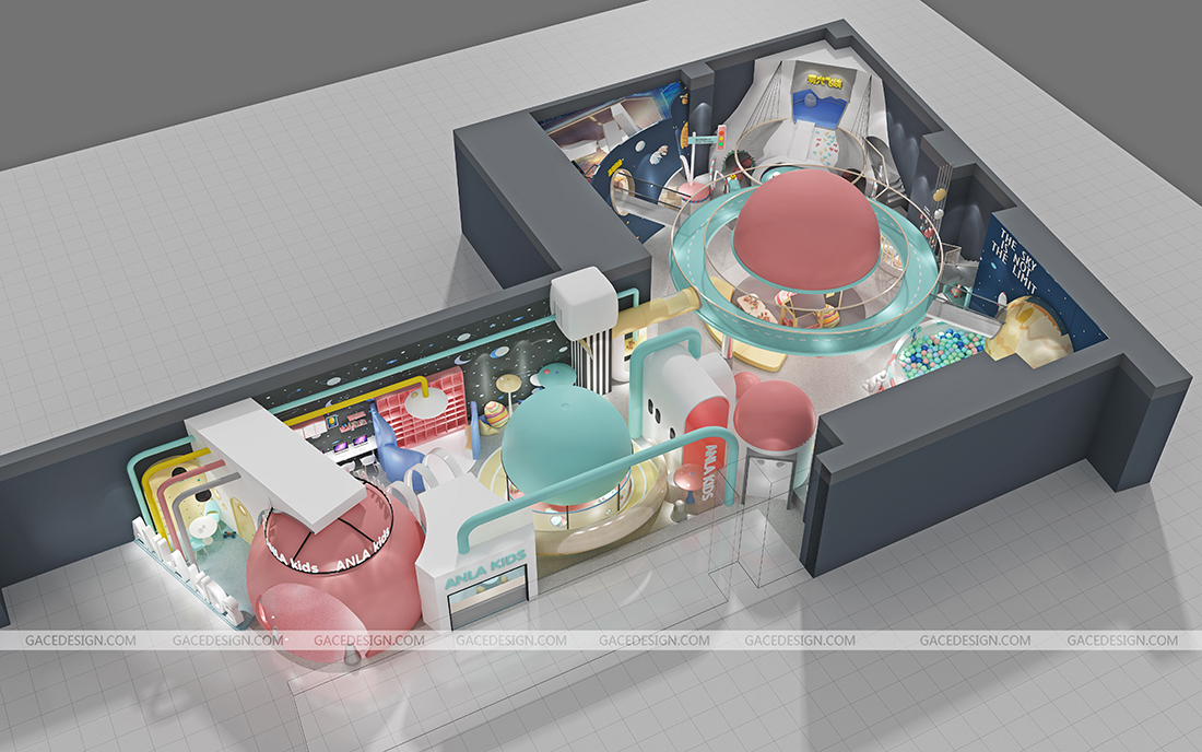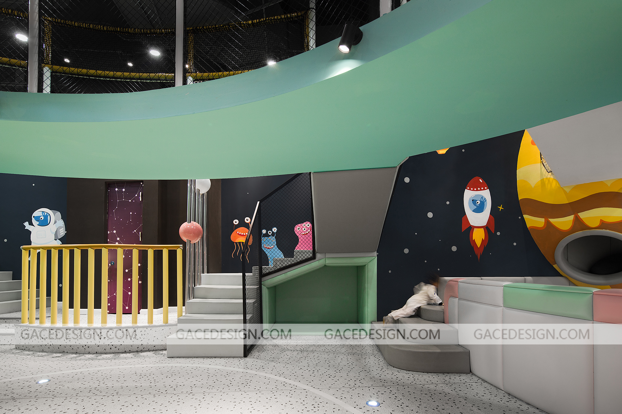 設(shè)計(jì)師將游樂場(chǎng)主題定為“未來星球”,以“未來”作為設(shè)計(jì)方向,以“星球”做為設(shè)計(jì)的核心。各種體量的“星球”在太空中穿行,打造出豐富多彩的星球世界。設(shè)計(jì)師根據(jù)孩子的冒險(xiǎn)精神設(shè)定多種游戲玩法和路線,孩子進(jìn)入游樂場(chǎng)后,首先需要了解故事背景,在置身其中不斷迎接挑戰(zhàn),最終完成“拯救家園”的任務(wù)。整個(gè)游樂場(chǎng)分為前端接待區(qū)、中端靜態(tài)游戲區(qū)、后端動(dòng)態(tài)游戲區(qū)。