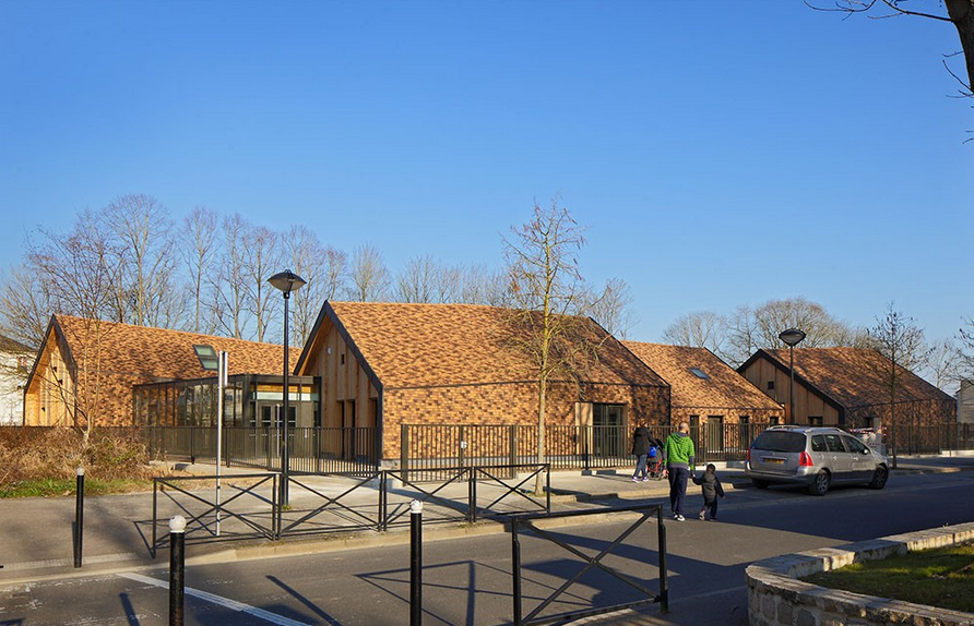 一座位于巴黎利耶于桑的幼兒園,設(shè)計(jì)師設(shè)計(jì)了大地色的陶瓷磚陶瓷磚的重疊像鵝卵石一樣覆蓋在獨(dú)特的坡屋頂建......