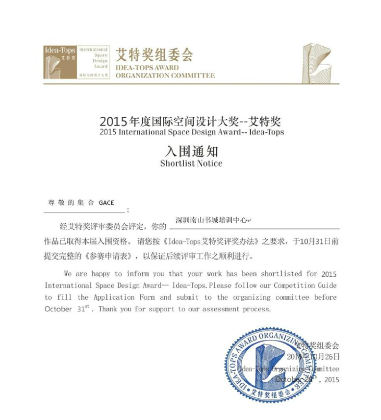 國際空間設(shè)計(jì)大獎(jiǎng)——Idopsea-T艾特獎(jiǎng),由中國建筑室內(nèi)設(shè)計(jì)行業(yè)第一門戶網(wǎng)站——中華室內(nèi)設(shè)計(jì)網(wǎng)聯(lián)合中國三大權(quán)威學(xué)術(shù)機(jī)構(gòu)——清華大學(xué)美術(shù)學(xué)院、中央美術(shù)學(xué)院、天津美術(shù)學(xué)院共同發(fā)起主辦,每年一屆,12月隆重頒獎(jiǎng),旨在打造全球最具思想性和影響力的設(shè)計(jì)大獎(jiǎng),發(fā)掘和表彰最佳設(shè)計(jì)師和最佳設(shè)計(jì)作品。深圳集合設(shè)計(jì)作品深圳南山書城培訓(xùn)中心得到大賽評(píng)委們的一致的認(rèn)可,獲得最佳文化空間設(shè)計(jì)入圍獎(jiǎng)。與諸多國際設(shè)計(jì)師同行同臺(tái)競(jìng)技,交流設(shè)計(jì)理念。也是集合設(shè)計(jì)公司一直熱衷和堅(jiān)持在做的事情。