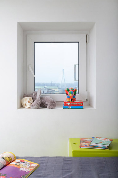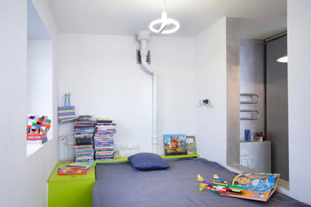 除了迎合兒童口味的亮麗色調外,室內還可以看到多處節(jié)省空間的精巧設計,如可以閉合的廚房&餐廳、位于門廳的浴室、便于儲物的墊高的床等,以滿足兒童對視野和活動空間的需求。