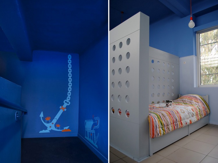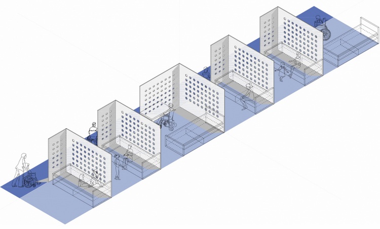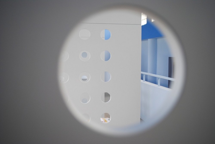 睡眠空間包含兩部分,一是隱藏空間,一是“凹處”?!半[匿處”的穿孔木制面板創(chuàng)造了獨(dú)立而且光學(xué)連續(xù)性良好的房間,而在“凹處”靠床一面的墻壁則被加厚,床深深嵌入環(huán)繞它的墻壁里,保證了在公共房間內(nèi)的隱私。