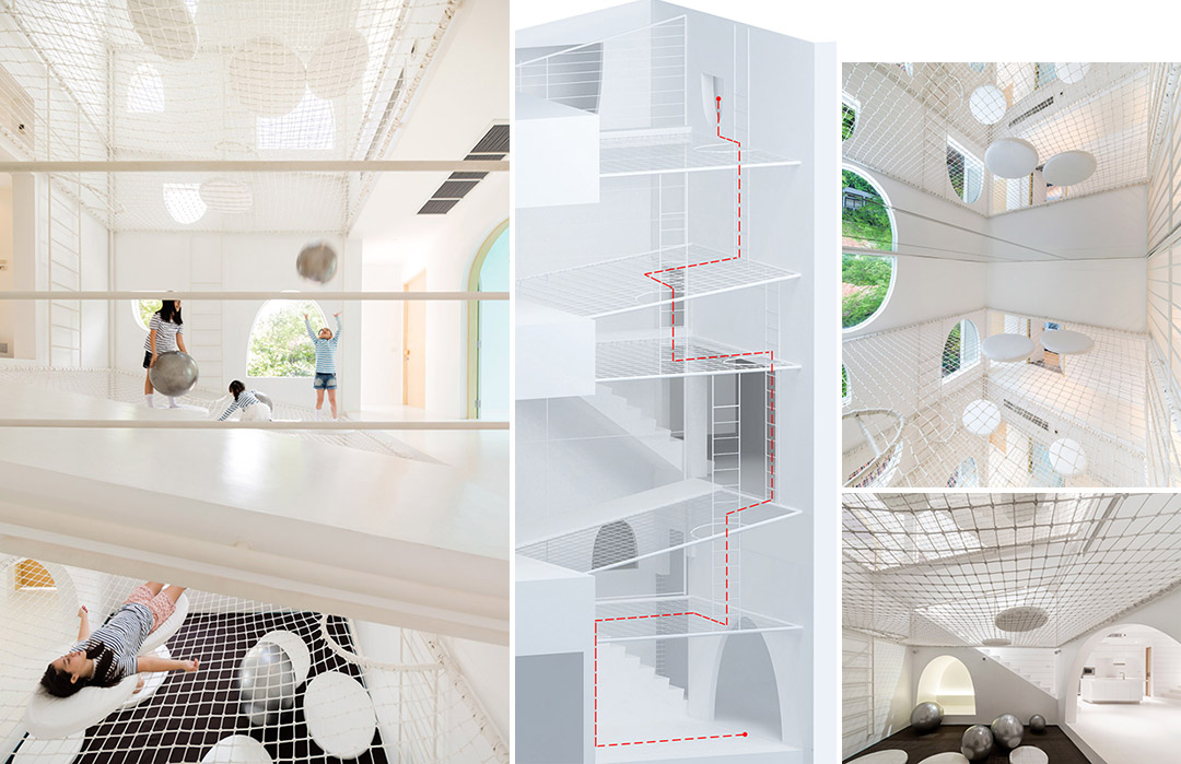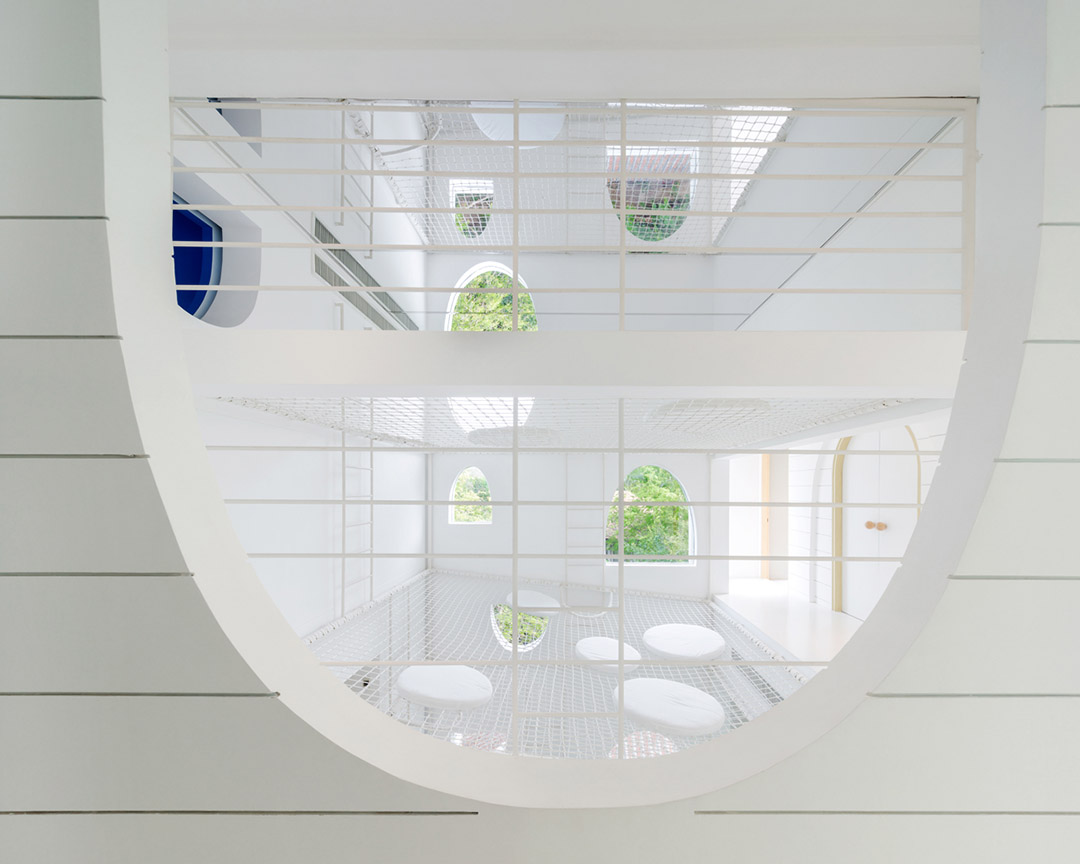 Onion用定制的繩網(wǎng)打造了五層不同傾斜度、高度及尺寸的水平網(wǎng)層。五層繩網(wǎng)在三層高的生活廳內(nèi)充當著地板的角色,并且分別在每一層的不同位置設有一個孔洞。父母和孩子們可以通過金屬樓梯從地面層爬到三樓的一間兒童房。