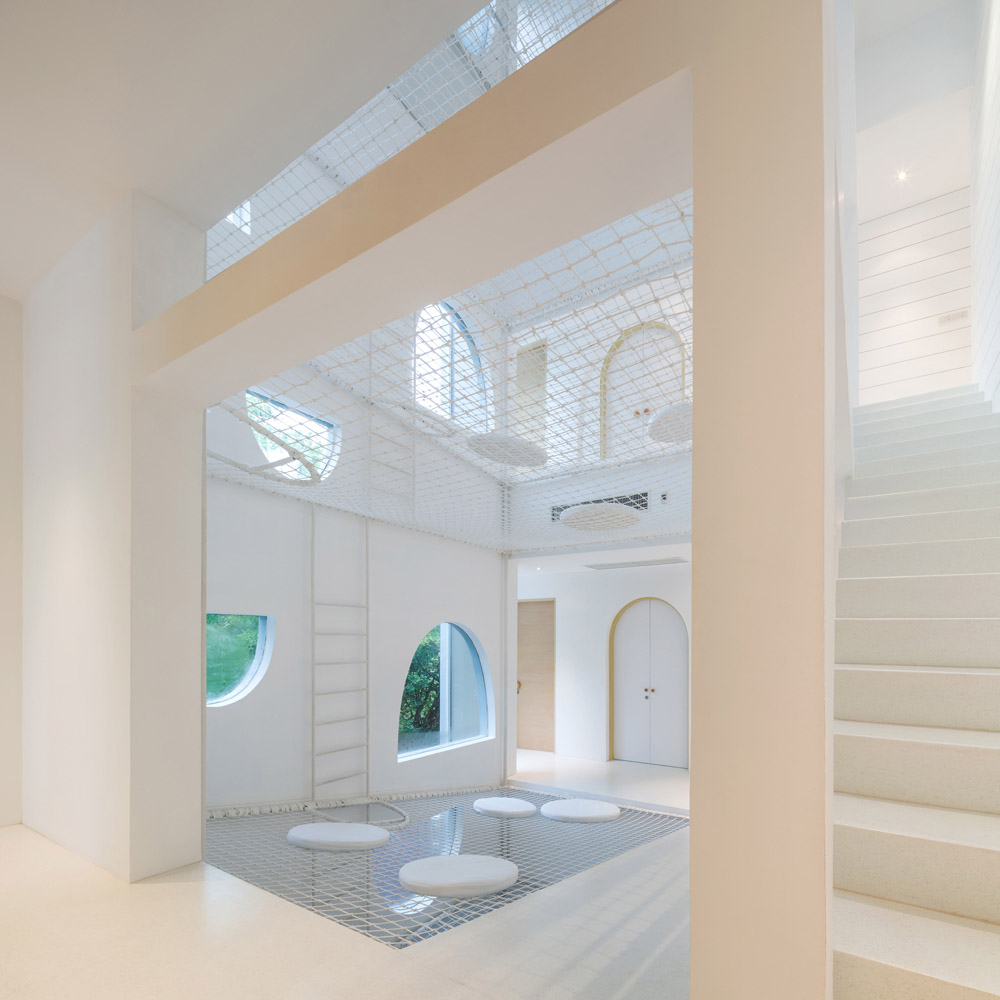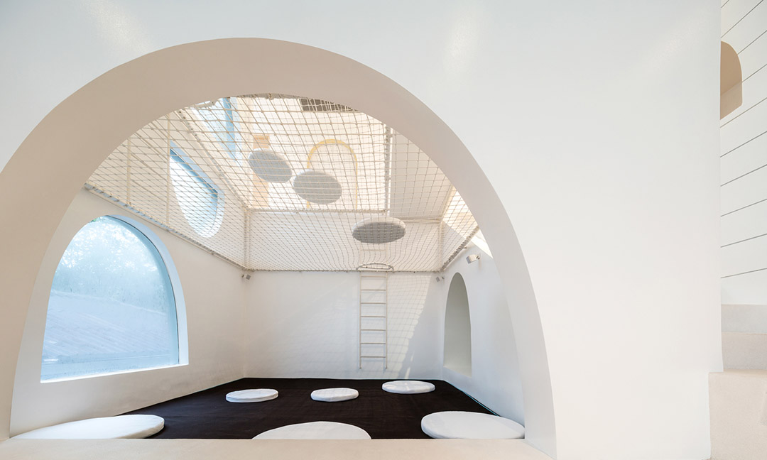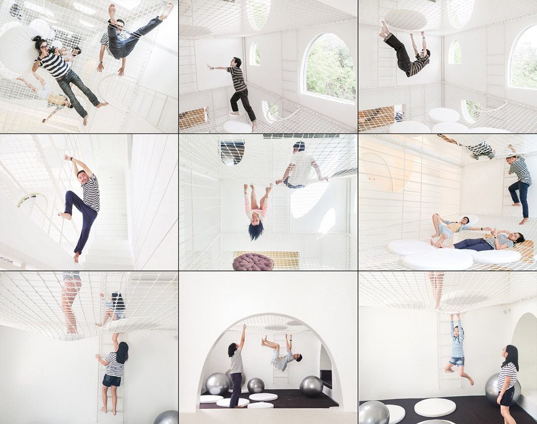 由于有下層繩網(wǎng)的保護,孩子們跳出床外或掉進孔洞都不會產(chǎn)生危險。懸吊在繩網(wǎng)上成為一種新玩法。抬頭看向天花板上的鏡面時,吊掛在繩網(wǎng)上的人似乎懸浮在空中,層疊的網(wǎng)層看起來比它們實際的高度更高。
