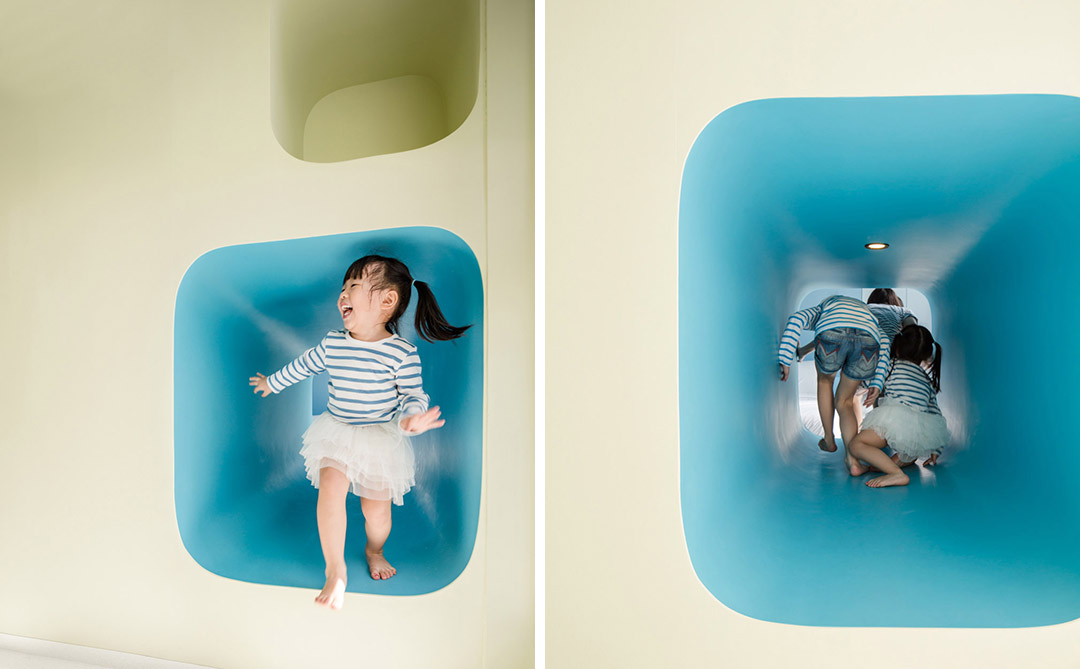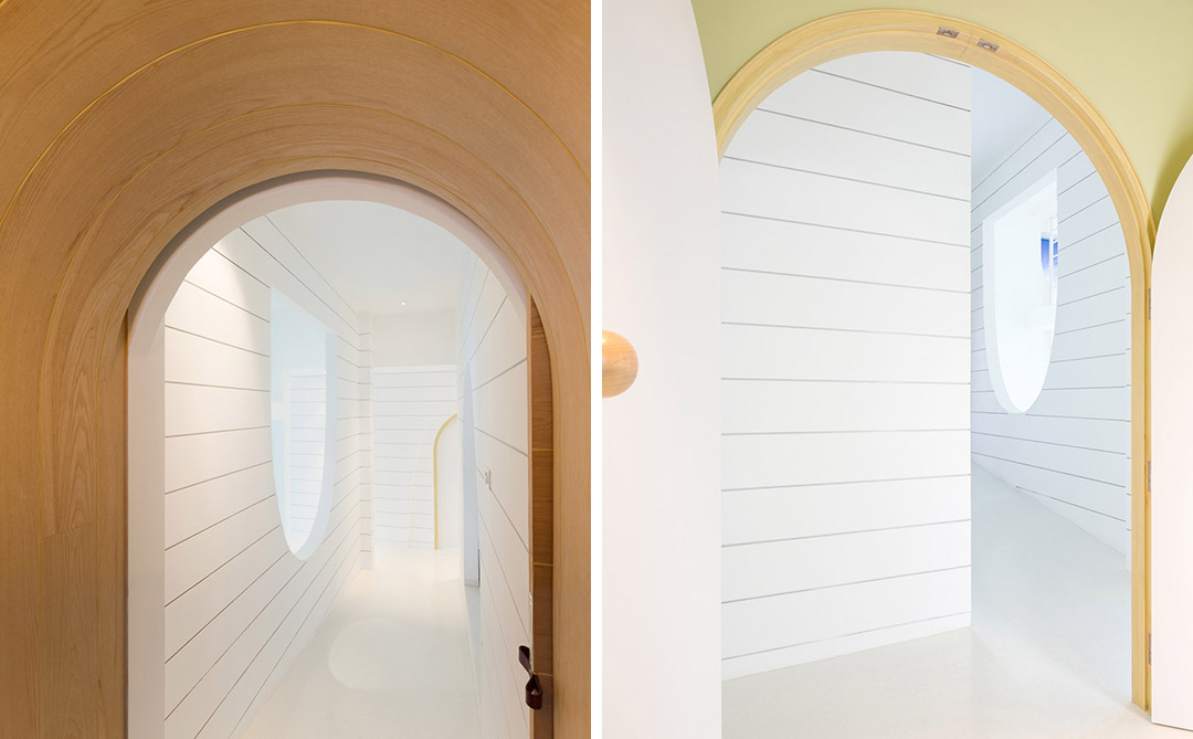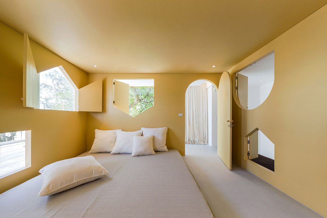 跑、爬、藏、懸掛、甚至下落等身體活動在日常生活中并不常見。Onion將1940年上映的美國動畫片“貓和老鼠”作為該項目室內(nèi)設計的參照標桿。如果Jerry為自己修建房子的話,很有可能會是一個巨大的奶酪房,里面設有幫助自己躲避Tom追趕的“莫比烏斯圈”逃跑路線。建筑師將該住宅設計成一個深受孩子們喜愛的樂園,讓全家在七巖海灘的假期更有意義。