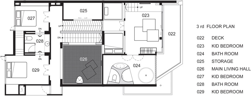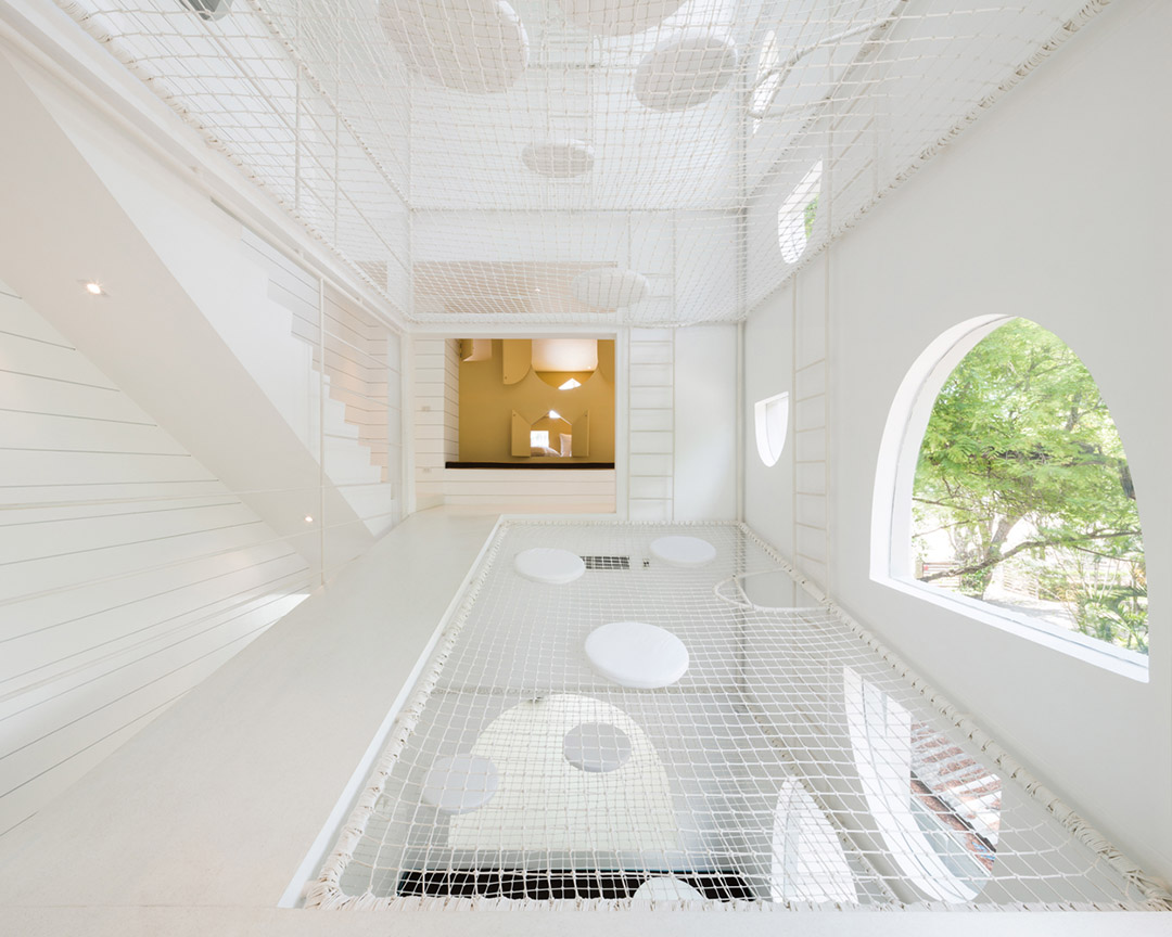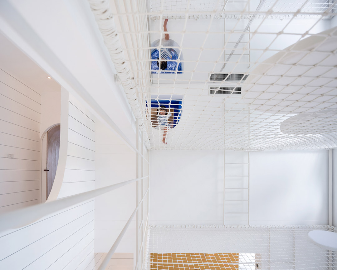 主生活廳為包括祖母在內(nèi)的每一個家庭成員帶來了愉快的假期時光,這里成為Jerry House最常用和最富生氣的空間。孩子們甚至不愿意睡在臥室,而是將枕頭和被子拿到繩網(wǎng)上來睡覺。他們睡在相當于二層半的第四層繩網(wǎng)上。Jerry House讓孩子們睡在空中的夢想成為現(xiàn)實。