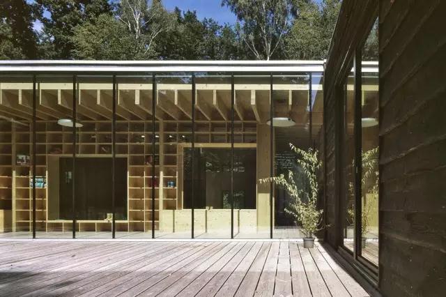 考慮到無柱玻璃立面,屋頂?shù)膽姨暨吘壊扇≈绷⒘旱男问?,無邊緣的粗鋸落葉松板形成包層。外表面帶有各種參差不齊的邊緣,與周邊自然相聯(lián)系。露臺(tái)交替布置,使建筑進(jìn)一步與周邊蔥翠的環(huán)境相融合。