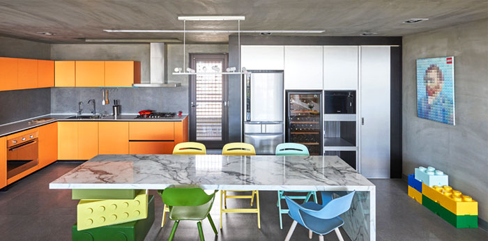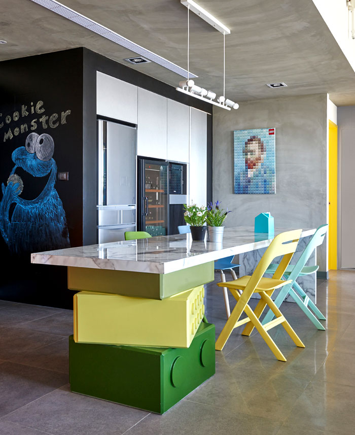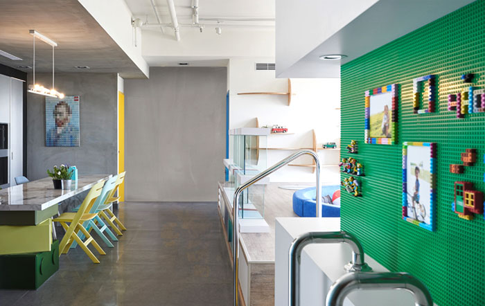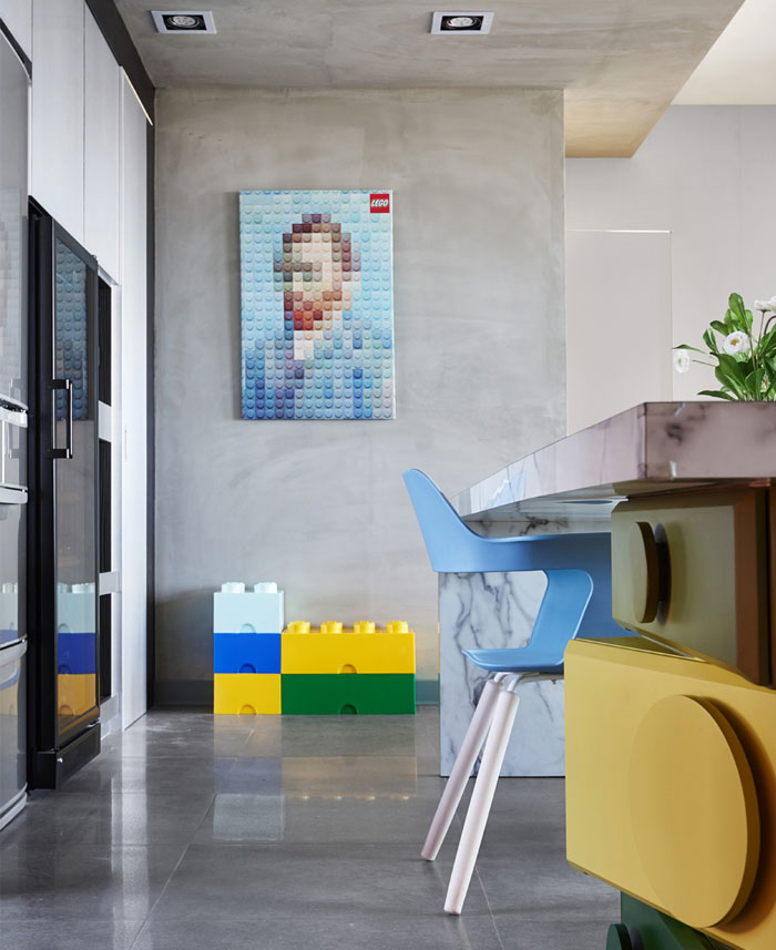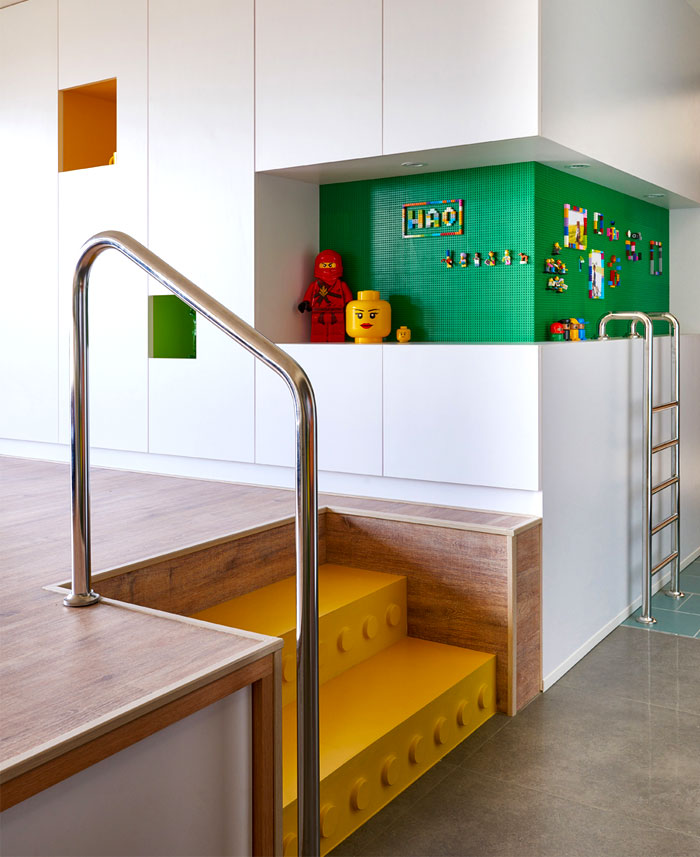 在任一角落似乎都能捕捉到樂高元素,臺(tái)階,展示柜,餐桌甚至是墻上的掛畫都被打上了標(biāo)簽,不同色彩的積木條不僅增添趣味性還讓整個(gè)空間變得豐富起來。