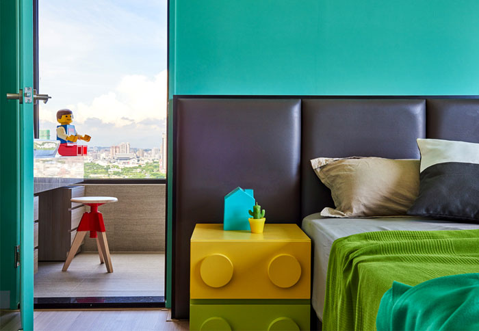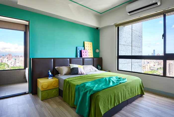藍(lán)色,綠色,黃色,臥室的色彩十分的跳躍,必不可少的樂高元素讓臥室起來就像是玩具中的空間,利用大窗戶帶來的良好采光,降低鮮艷色彩帶來的視覺疲勞,這樣一個(gè)充滿童趣的空間也拉近了父母與孩子的距離。