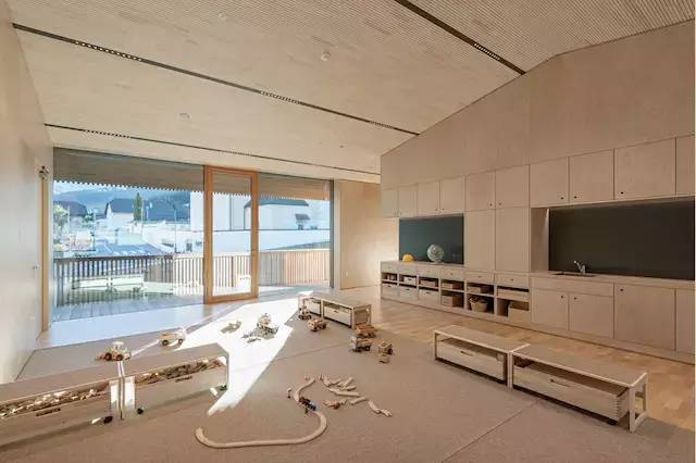 在小鎮(zhèn)的教堂附近,有一座新建的占地950㎡的幼兒園,幼兒園有一個(gè)大大的露天庭院,院里種植這草皮,還設(shè)計(jì)有一小塊沙地,孩子們可以在這小沙池中玩耍,靠近庭院的一面墻體的設(shè)計(jì)也是非常有意思,里面是安裝了木梯的攀巖墻,還有一部滑梯,所以即便是雨天,孩子們也可以在這個(gè)小天地里愉快的玩耍。幼兒園的設(shè)計(jì)也遵循著小鎮(zhèn)的風(fēng)格漆白的墻面外部用木材裝飾和周?chē)男℃?zhèn)建筑以及自然景物,和諧相融。