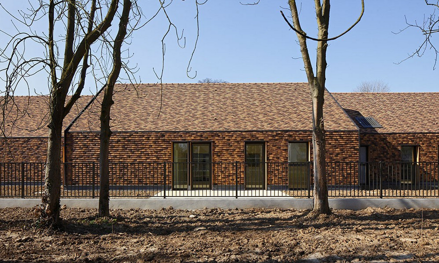 一座位于巴黎利耶于桑的幼兒園,設(shè)計師設(shè)計了大地色的陶瓷磚陶瓷磚的重疊像鵝卵石一樣覆蓋在獨特的坡屋頂建筑表面,裝點著幼兒園。覆蓋了整個幼兒園的屋頂和墻壁,遠遠看去就像是聚集在一起長滿鱗片的建筑群。