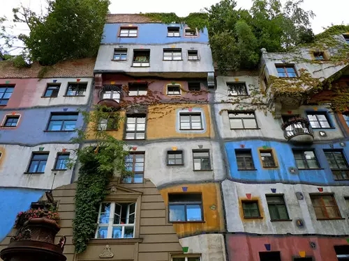 由藝術(shù)家改行為建筑師的佛登斯列·漢德瓦薩在好友的幫助下設計建造了百水公寓。百水公寓建于1983至1985年間,包含了一棟一層樓和一棟兩層樓的公寓。百水公寓包含了很多自然元素,樹木會在房間內(nèi)生長,樹木的枝干在船外延伸。不過這樣設計,經(jīng)過歲月的沉淀,想必會被植被慢慢吞噬。