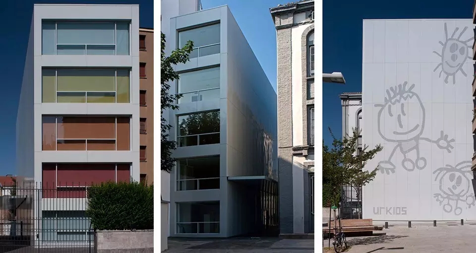很多幼兒園都是占地面積廣闊,空間很大,但是有一所特別的幼兒園是特例,他就是UrKids幼兒學(xué)校,幼兒園是一棟白色五層高樓,就像是人們說的紙片樓,而設(shè)計(jì)師們則是把入口建在了建筑的長邊上。