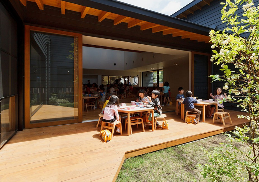 連接建筑物所產(chǎn)生的空間被用作庭院和按不同年齡段分類的花園。計劃中庭院的大小存在適當(dāng)?shù)木嚯x,使孩子們可以看到同一水平的風(fēng)景。在兒童衛(wèi)生間,面對庭院的圖畫書室、餐廳和嬰兒室,可以建立他們在生活中自然地看到彼此的關(guān)系。