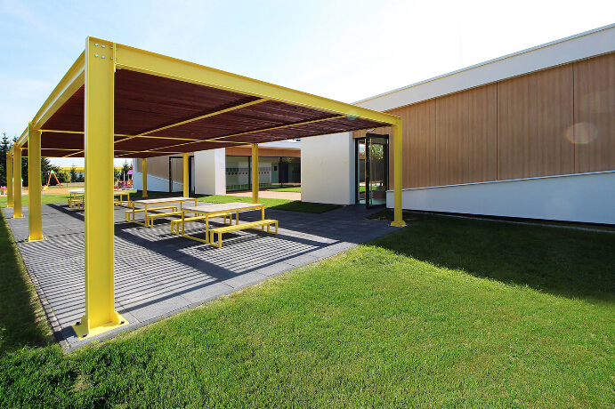 幼兒園前面的庭院設(shè)置有采沙坑和樹木,在建筑物的心臟。建筑前面有一處涼亭,涼亭里面有小桌子和凳子,都是用黃色顏料粉刷的,是供孩子們下課時享受日光浴的好去處。建筑中廳向著中庭開放,大大的窗子允許自然光最大程度地通過。儲物室和教室直接連通。儲物室的窗子可以滑開,方便了孩子們選擇最短的途徑奔向花園玩耍。有著低矮屋頂?shù)挠悦孀呃仁峭ピ旱耐ǖ?,走廊的玻璃窗模糊了里面和外面的邊界。?/span>幼兒園室內(nèi)設(shè)計(jì))