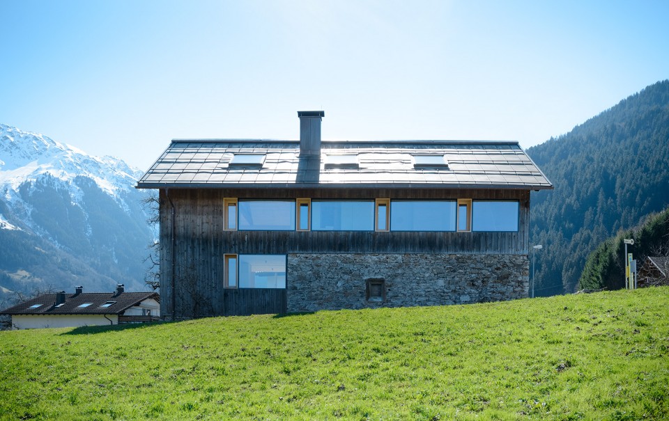 這棟建筑低于相鄰的Zelfenstra?e一米,坐落于一個(gè)小槽中。細(xì)長(zhǎng)的建筑和其縱向的山墻順應(yīng)地勢(shì)的緩坡。在磚打造的建筑基地西北面可以清晰的看到這個(gè)自然的緩坡。住宅自由的散落于這片景觀中,被一片草地包圍。草地生長(zhǎng)繁密,在一定程度上限制了開(kāi)放空間的設(shè)計(jì),建筑師不得不處理清除住宅區(qū)域的植物。一堵干石墻連接了入口和街道。街道距離墻體有兩米的距離。未經(jīng)加工的木材立面跟隨光影的變化而發(fā)生顏色改變,從黑到棕橙到銀灰變化多端。建筑銅材質(zhì)的屋頂平衡了建筑環(huán)境中大片的綠色。