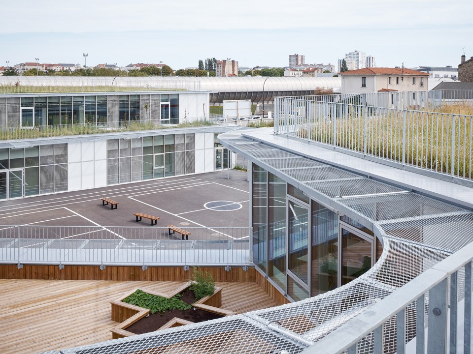 學(xué)生宿舍的設(shè)計(jì)基于4個(gè)主要建筑學(xué)原則。首先,項(xiàng)目作為一個(gè)整體要具有合理的功能(結(jié)構(gòu)和技術(shù)空間的疊加),同時(shí)還要緊湊。距離其他功能分區(qū)的距離使它有所脫節(jié),具有一定的獨(dú)立性。由于宿舍區(qū)被設(shè)置在盡可能北的方位,最窄的立面朝向Jean-Jaurès大街,平臺(tái)不會(huì)阻擋陽光進(jìn)入室內(nèi)。這也保證了操場(chǎng)能夠享受足夠多的陽光。