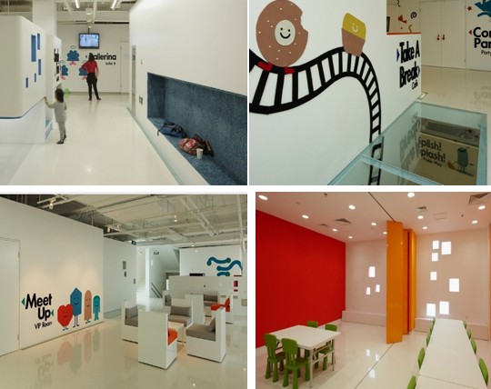 家盒子的外觀,設計師采用了一個多孔的造型結構,為了避免室內過熱。同時更傾向于把這個外觀看做一張白紙,利用孔洞大小變化制造出了一系列兒童涂鴉的形狀,并以此來呼應主題。使得整個兒童空間的造型設計非常巧妙、獨特。