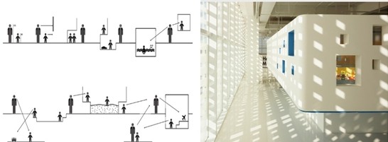 設計師首先考慮到兩種身高帶來的視角區(qū)別。因此在兒童內部空間中設計一些專供兒童使用的低矮空間。就如同我們小時候爬假山的山洞,或者拿沙發(fā)墊子搭的城堡。另一方面父母還必須負起監(jiān)護的職責,所以主要活動室的設計升高到成人目光可以透過窗子平視的高度。這樣就更有利于家長觀察孩子的動向,設計師最終在大空間內部搭起一系列“小盒子”。呈現(xiàn)出升高的教室,供家長窺視的小窗,還有盒子底下只有孩子才能鉆過去的通道。我相信小孩們總會對這種特別的兒童空間設計感到興奮和安全感。