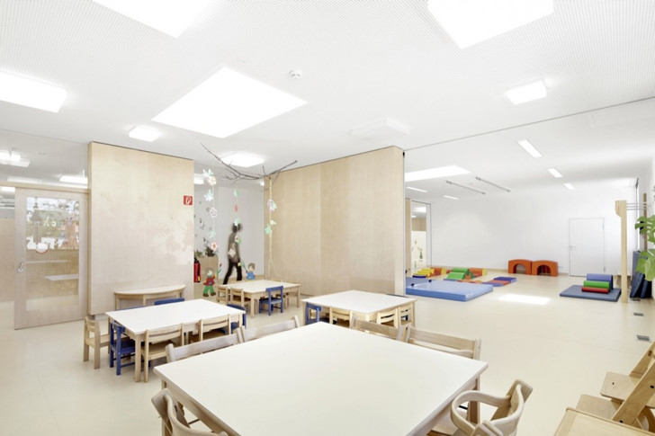 屋頂?shù)脑O(shè)計(jì)和開(kāi)放活動(dòng)室形成一個(gè)新的介于內(nèi)部與外部之間的空間。通過(guò)在南北方向的單位位移,在活動(dòng)室之間形成了視覺(jué)連接效果。這個(gè)專門為幼兒園設(shè)計(jì)的活動(dòng)室完全可以融入教學(xué)工作中。