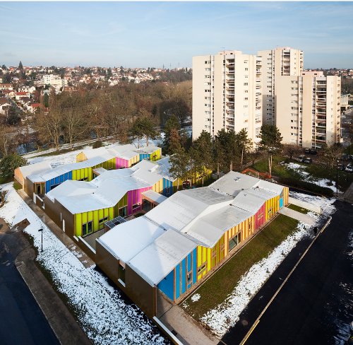 這是由法國事務所ECDM設計的一個托兒所項目,它呈現(xiàn)出起伏的混凝土墻壁,這種漣漪的效果是通過采用一系列的預制板面形成的,它們環(huán)繞建筑的三側,只有一側包含開口的窗戶。一個院落位于兩層樓的中心,周圍環(huán)繞為孩子們準備的房間,可以容納66名孩童。一個樹形的金屬傘遮擋結構為院落提供遮陰,從街道看去好似漂浮在屋頂之上。