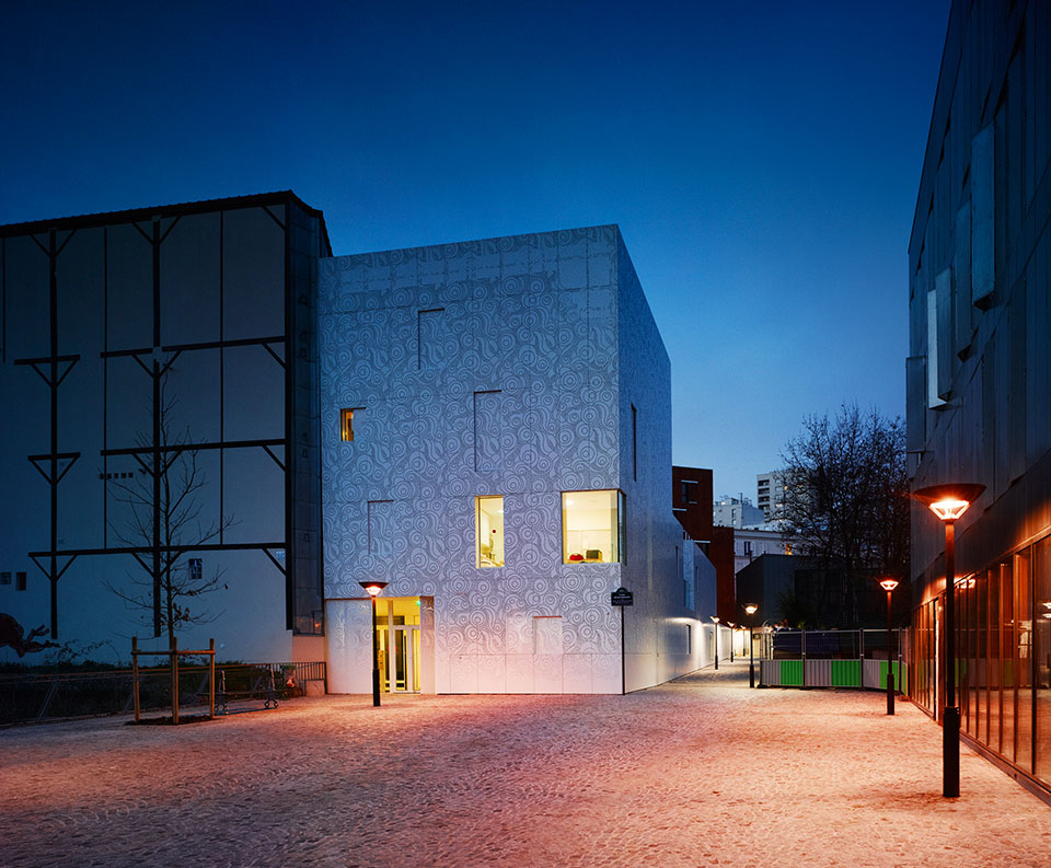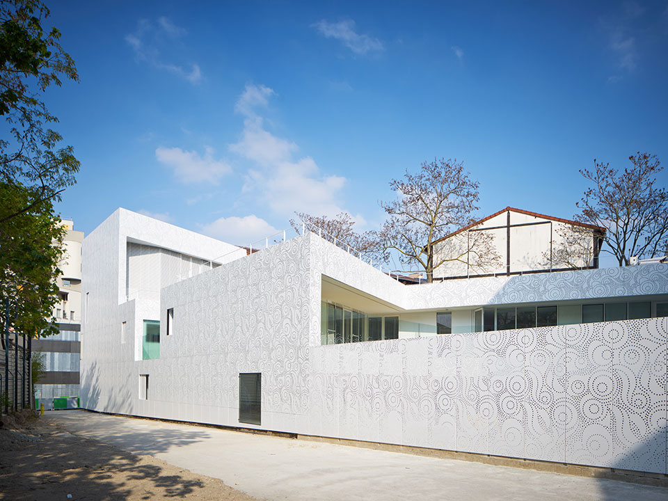 法國(guó)建筑事務(wù)所Avenier Cornejo設(shè)計(jì)的巴黎20區(qū)幼兒園建成,這所可容納66個(gè)孩子的幼兒園是一座獨(dú)特的建筑,為兒童提供安心的環(huán)境。建筑以混凝土為結(jié)構(gòu),滿滿占據(jù)著三角形地塊,并沿兩側(cè)邊緣開(kāi)了三個(gè)內(nèi)庭院,為建筑提供充足的陽(yáng)光與光線。建筑周身覆蓋有著美麗花樣的金屬穿孔板。這層金屬外表皮還覆蓋了部分窗戶,為其提供過(guò)濾的光,并在夜晚像燈籠一樣透光。傍晚來(lái)臨的時(shí)候,兩旁的路燈亮出詳和的燈光,好像都在刻意討好這所幼兒園。它就像一位非常漂亮文雅的姑娘,周?chē)ㄖ吐窡舳际菙≡谒氖袢瓜碌募澥? 此幼兒園的顏色和圖紋,與周?chē)ㄖ氡厥悄敲磁c眾不同,一下子就能夠把人們的目光吸引住了。
