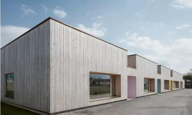 集合少兒設(shè)計機構(gòu)分享:目前幼兒園正在準(zhǔn)備向東北方向擴建,為了尊重原有建筑的設(shè)計并保持與它空間上的聯(lián)系,擴建部分與老建筑完全獨立,形成了一個20米寬,65米長的全新木制空間。像毛毛蟲一樣,建筑物用重復(fù)、特定的韻律感在小溪邊展開。外立面垂直的木板條會隨著時間變化而優(yōu)雅地老去,與景觀和諧共存。與建筑一側(cè)的就空間一樣,新的幼兒園使用了同樣貼近低矮的、貼近地面的設(shè)計。每個模塊中間都有大的方形窗戶,在視覺上形成了整體的效果。建筑前部的門廊形成了一個半室內(nèi)的“停車場”,為孩子們的腳踏車和其他游戲提供適合的場地。