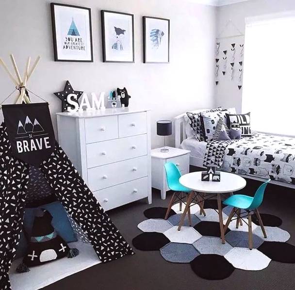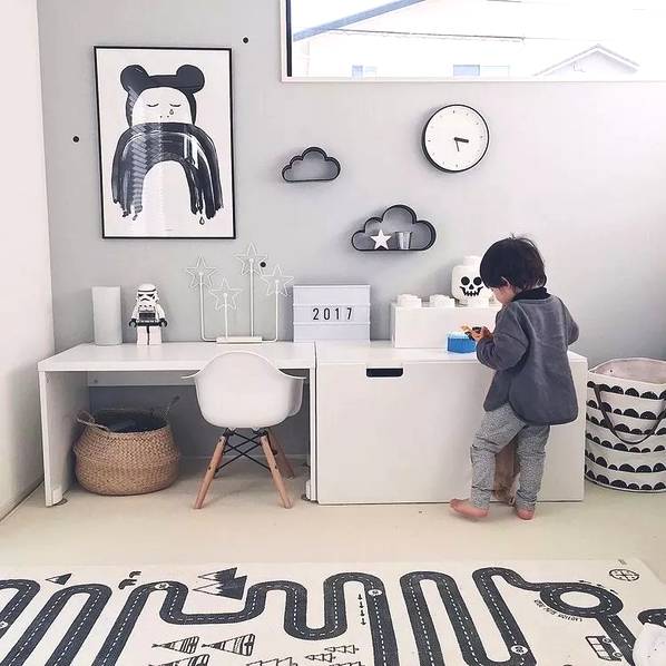 房間里還可以設(shè)置一些簡(jiǎn)易的玩樂(lè)設(shè)施。1-3歲的孩子需要父母的時(shí)刻陪伴,我們可以在房間或者客廳放上爬行墊+安全圍欄給孩子一個(gè)小區(qū)域領(lǐng)地,把這里變成一個(gè)親子小游戲區(qū)。在兒童房里也可以在地面貼上玩具貼紙,把局部地面變成孩子的游戲地圖,適合在游戲中培養(yǎng)孩子創(chuàng)造力和分享的意識(shí),留出空間,讓孩子可以和朋友或者和父母一起玩玩具,孩子1歲之后我們可以適當(dāng)添置一些矮柜來(lái)收納玩具,還可以讓孩子扶著學(xué)走路。在兒童床上加一個(gè)木架結(jié)構(gòu),把床做成木房子,給孩子一個(gè)開(kāi)放的獨(dú)立空間。這種具象的區(qū)域不僅會(huì)給孩子安全感,還能滿足他們的探險(xiǎn)欲,