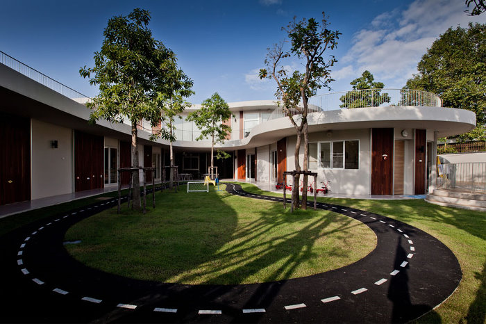 有一所有趣的幼兒園,這個(gè)院子里有著耀眼白色跑道的肯辛頓國(guó)際幼兒園位于泰國(guó)曼谷,在2012年的時(shí)候完工。項(xiàng)目主旨在于激勵(lì)孩子們用自己的空間想象感知找到玩樂(lè)的趣空間。