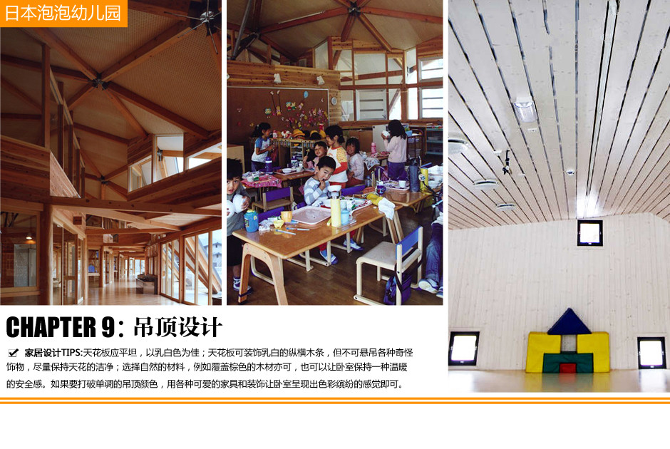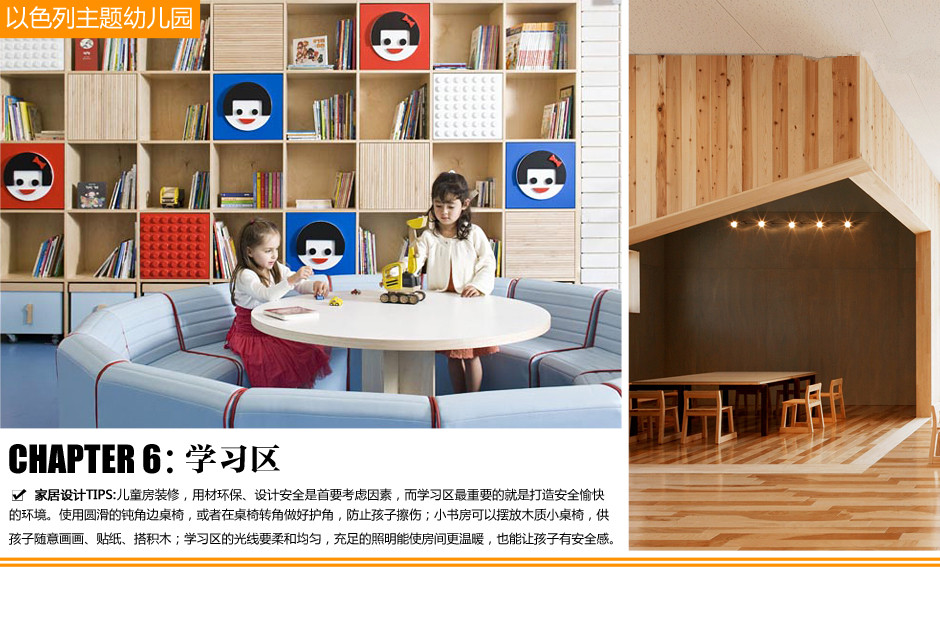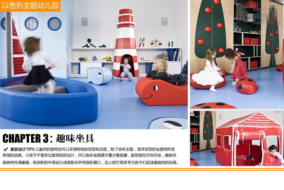 3、這是幼兒園的其中一間教室,低矮的花型座椅散亂分布在教室四處,立體紅蘋果懸掛在樹形的模型上,黑板上懸掛著松樹圖案的浮雕。微型帳篷安放在教室的中心區(qū)域,里面填滿了紅白兩色的乙烯基塑料填充物,悅目的色彩給童年增添了不少生動的記憶。