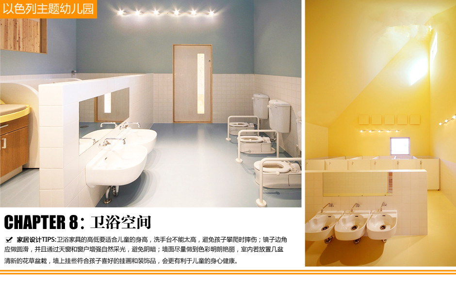 8、這間幼兒園是單層的,突出的天窗讓幼兒園有挑高的天花板。幼兒園有一間衛(wèi)浴間,這里小巧的用具都是為孩子度身定做的,位置低矮方便孩子的使用。要避免在衛(wèi)浴間擺放玻璃等易碎物品,近地面的電源插座要隱蔽好,防止造成小孩子不小心觸電。