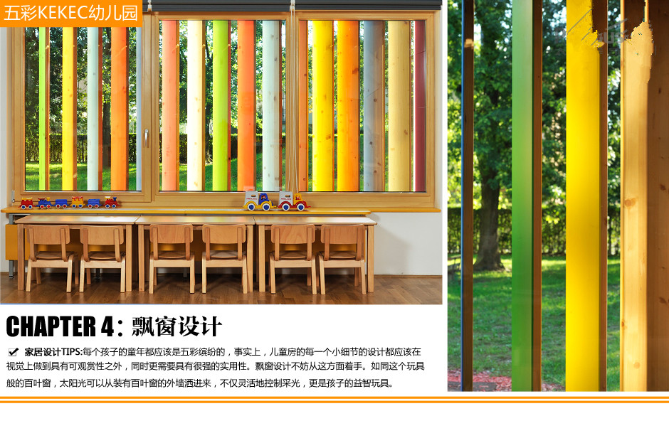 4、這座幼兒園建筑的玻璃表面裝有一層可旋轉(zhuǎn)的垂直百葉窗,百葉窗的木條一面漆有五顏六色的油漆,另一面則保持木材的原樣。這些木條除了可以用來遮光,為小朋友提供娛樂設(shè)施之外,還能讓小朋友們在玩耍中學(xué)會用雙眼分辨這九種顏色。
