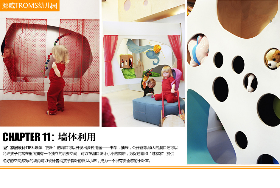 11、墻是這所幼兒園空間的核心設(shè)計元素。一般意義上,墻體只承擔(dān)分隔空間和隔音的作用,但這里被賦予了更豐富的功能?;蛘哒f,家具與墻的界限變得非常模糊。簡單的折疊和推拉墻面即可改變房間的大小,創(chuàng)造出容納新功能的空間。墻面采用不同的材質(zhì),擁有鮮艷的色彩,并且開設(shè)了許多形狀大小各不相同的洞口。
