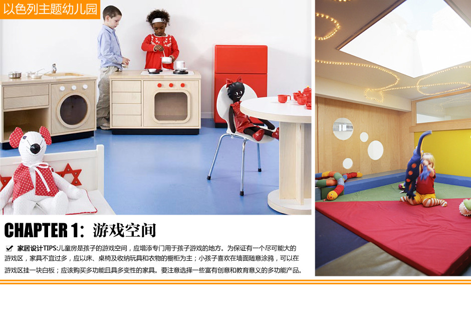 1、幼兒園的活動室可愛而多變化,具備光線充足、空氣流通、色調(diào)柔和三大條件。空間以藍(lán)色、白色、紅色及天然木質(zhì)原色為主,玩具設(shè)施以啟發(fā)性大、危險性小為宜。這個活動室以模擬家具為特色,玩具冰箱、玩具烤爐,甚至是玩具醫(yī)護(hù)床,都是純手工的木雕作品,它們經(jīng)過涂漆、貼膜的處理,呈現(xiàn)出家的感覺。